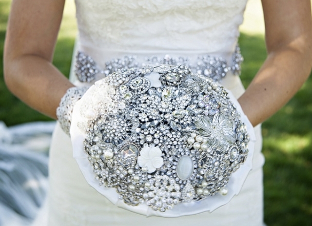 Bouquets of jewelry . Ketiadaan bunga di tangan pengantin adalah penyelesaian asal bagi mereka yang berusaha untuk membuat perkahwinan yang tidak standard tetapi pada masa yang sama canggih. Tahun ini, popular adalah karangan mutiara, rhinestone, batu permata, serta hiasan dari perak, pita satin, penempaan.