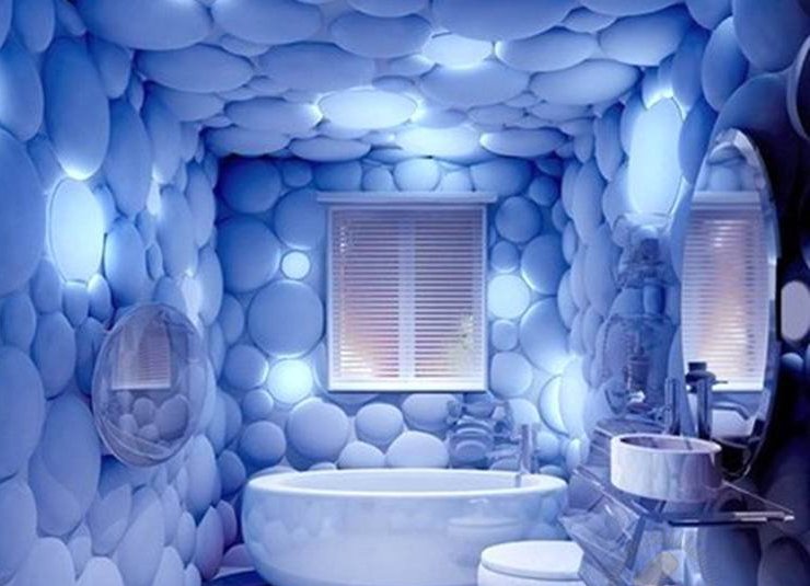 Panel 3D di dalam bilik mandi boleh dibuat daripada kaca marah atau akrilik. Ciri membezakan utama mereka - imej atau bantuan yang terang, yang digunakan dengan bantuan teknologi khas. Panel seperti itu menduduki tempat utama dalam hiasan dinding bilik mandi.